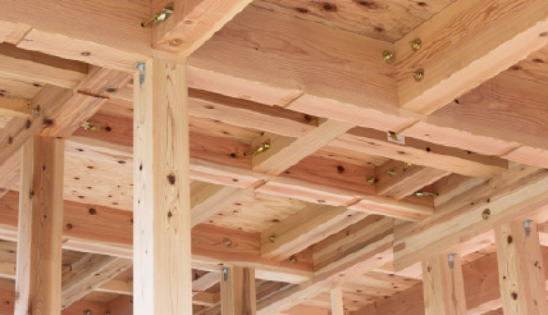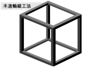 木造軸組工法と木の軸組(柱、梁、土台)で壁、屋根などの荷重を受ける工法。仕口(接合部)の工夫や筋交い、火打ち等の斜め材により構造体を安定させ、強くします。木造在来工法ともいいます。