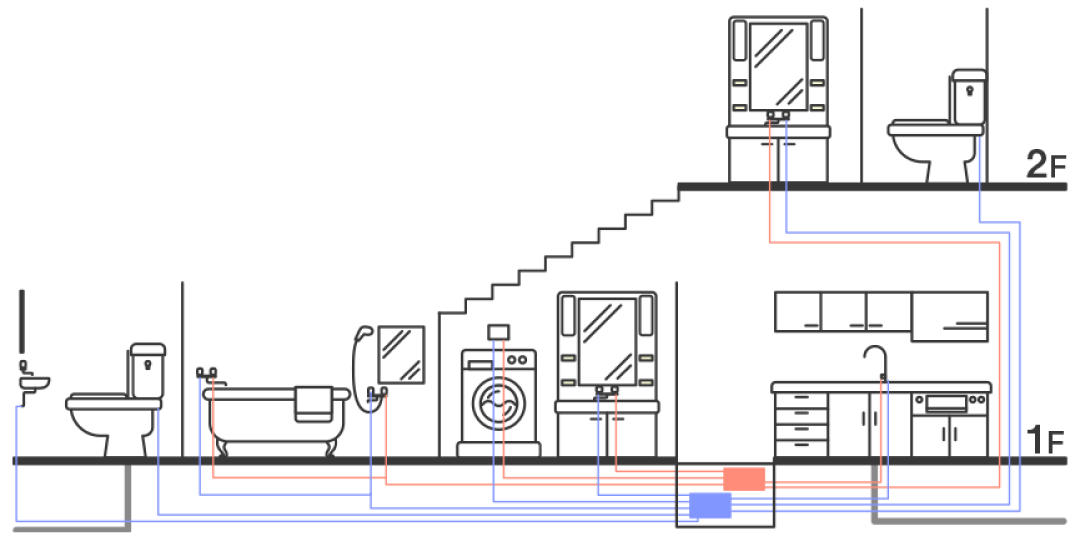 メンテナンスのしやすさを考えた配管 住宅の排水管・給水管・給湯管・ガス管の点検、掃除、補修、交換がしやすい施策が対策されています。メンテナンス、点検がしやすい給水配管を使用し、必要に応じ点検口を設けます。また、清掃のしやすさを考えた排水管を使用しています。