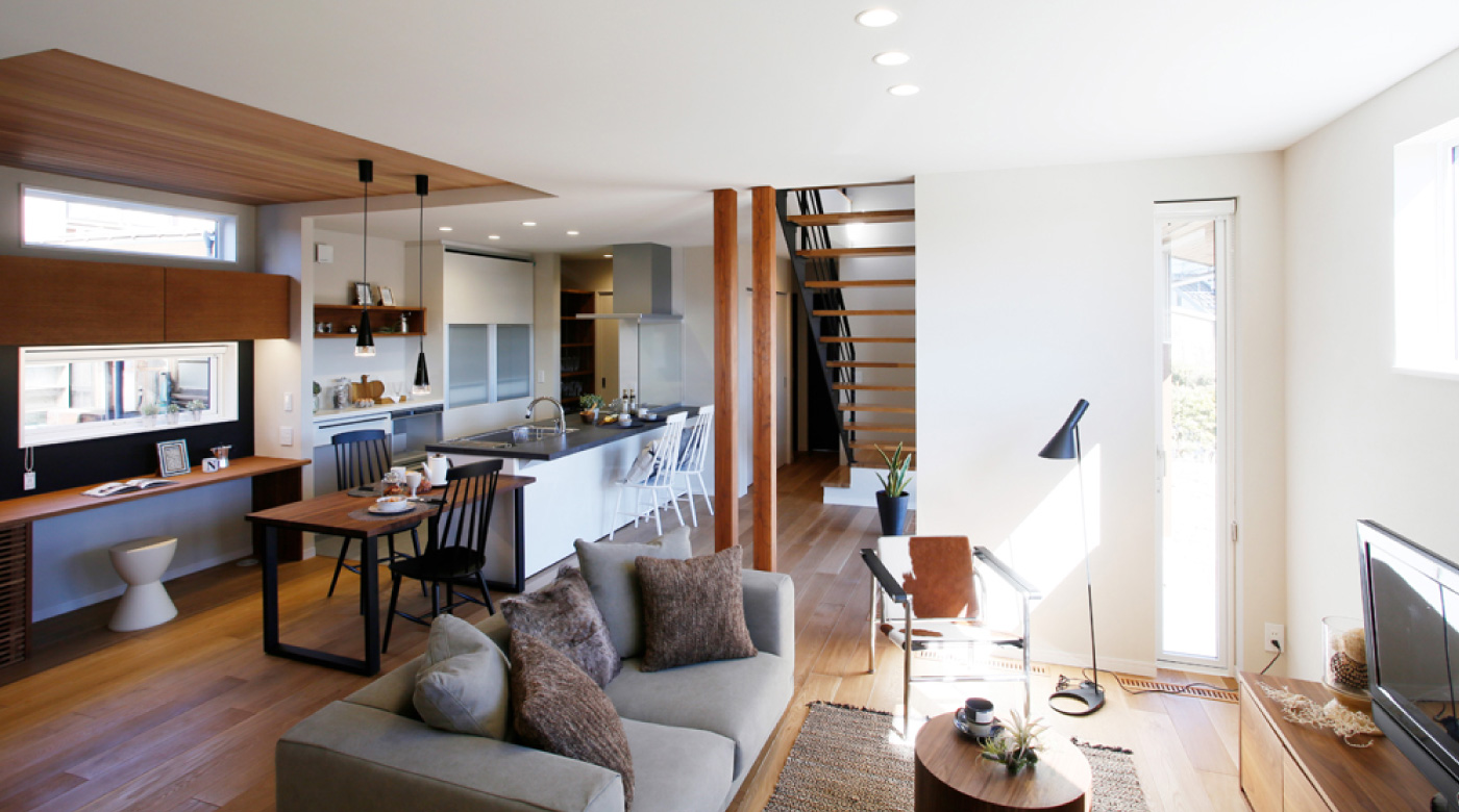 石川は夏暑く、冬寒い日本の中でも特に温度差の激しい地域です。一方で、冬場は全国でも日射取得が高い、そんな地域の特性をいかした家づくりをすることで、夏涼しく、冬暖かい暮らしをしながら冷暖房費のランニングコストを抑えた家づくりです。